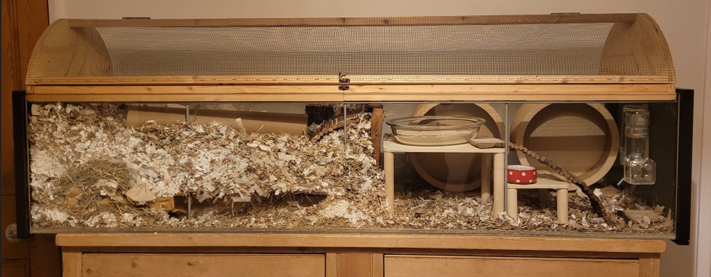Add a layer of substrate – we’ve used Green Mile cardboard plus some old bedding to keep the scent familiar. The water bottles are Living World 177ml glass bottle in a Lixit Holder and a Living World 177ml glass bottle in a Bucastate Magnetic Holder. Two bottles prevent resource guarding and if one fails you have a back up.Add a nest Box. We’ve used a Niteangel Birch Nest Box in Large and added in some unbleached, unscented, plastic free, toilet paper sheets, (we’ve used Naked Sprout) so your Gerbils can make their own nesting material. Also add some of their old nesting material so the scent is familiar to them. Scatter dry food into the substate, particularly on the right hand side where the substate won’t be so deep.Add a Log Divide to separate the wheel, food, and sand area from the deep burrowing and nesting area. We’ve used a Trixie Willow Bridge 65 x 40cm (L x H) There’s a hole in the bottom, roughly 2 logs wide and 2 inches high, so Gerbils can travel under it as well as over it, which helps them create their tunnels.Add your Wheel(s). As we have room we’ve added two so the Gerbils have one each to limit any resource guarding or squabbles. These are Trixie 28cm wooden wheels.Add a stand for your Sand Bath and to create an exit from one side of the tank to the other. We’ve used HappyHenrysHomes Platforms in pet safe wood 30cmx20cm with 20cm birch legs.We’ve used another HappyHenrysHomes Platforms 20cmx15cm in pet safe wood, with 10cm birch legs. This is for the water bowl and to scatter feed.A water bowl is added to the smaller stand, so there are 3 sources of water, 2 bottles and 1 bowl in case of bottle failure and to prevent resource guarding (where one Gerbil attempts to monopolise food or water). Add a Sand-bath so your Gerbils can keep themselves clean. This is a simple glass Pyrex dish with reptile sand. See our Enrichment, Wheels, & Sandbaths page for a choice of safe sands. Add a willow bendy bridge for access to the Sand-bath level. We’ve used a Hanging Bridge for Small PetsStart layering up your substrate. The base level is Green Mile cardboard, mixed with old bedding. This next layer is Fitch. Your choice of substrate is personal, but for some safe substrate and bedding choices see our Substrate, bedding & nest boxes page.Scatter dry food between layers to encourage foraging. This next layer is Meadow Hay. For hay types see our Substrate, bedding & nest boxes page.Add plain cardboard for enrichment. We’ve used plain eggboxes with any labelling taken off and cardboard coffee cup trays.Add another layer of the old substrate cleaned out from the previous tank. This is to keep the smell of the tank familiar to your Gerbils as they rely heavily on scent.We’ve added another layer of substrate, this time Carefresh.Add another layer of substate, Green Mile cardboard. Keep sprinkling dry food into the substrate to encourage foraging and don’t used a food bowl as this can cause resource guarding where one Gerbil attempts to hog the food.Add another layer of the old substrate from the last tanks cleanout to keep the scent in the tank familiar for your Gerbils. We’ve added more cardboard too.Add a Willow bendy bridge to create access from one side of the tank to the other. We’ve added another layer of Meadow Hay.Add another layer of substrate. This time we’ve used Fitch and Tea Bag Bedding. We’ve added Brown Postal Tubes 460mm x 76mm going down to nest to get the Gerbils started when we put them into their new tank.We’ve added another Brown Postal Tubes 460mm x 76mm to the top of the substrate to act as a hide – but this will become very useful when you want to get your Gerbils out of the tank as they will step into it and can be transported with no fuss. We’ve also added more eggboxes and cardboard.We’ve added more Tea Bag Bedding. Keep sprinkling dry food on to the top of the substrate. Add another layer of the old substrate from your Gerbils last cleanout. This keeps the scent in the tank familiar to your Gerbils on the top layer. Add plain, unscented, plastic free toilet paper sheets to the top of the substrate, so your Gerbils can use it to take underground to their nest box, to create their own nesting material. We’ve used Naked Sprout Toilet Paper. Add your Gerbils! Mr Marinakis and Freddie exploring their fresh new tank and getting ready to terraform it to their liking. Because of the size of their tank, they won’t need to be cleaned out again for at least 8 weeks. Don’t clean out your Gerbils too often as the are naturally very clean and find it stressful to have their habitat cleaned out too often. Sprinkle dry food regularly into the substrate and keep adding toilet paper sheets/nesting material, as their nests are constantly under construction.The same tank 6 weeks later. In this example, the mix of Green Mile, Tea Bag Bedding, Carefresh, Fitch and Meadow Hay holds tunnels well.