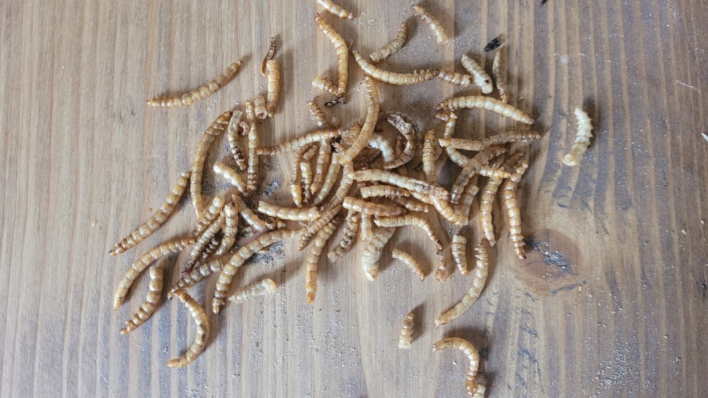 Mealworms: These can be purchased live or dried. Do not feed to excess. A few, once or twice a week is enough or mixed quantities as above into their daily food.