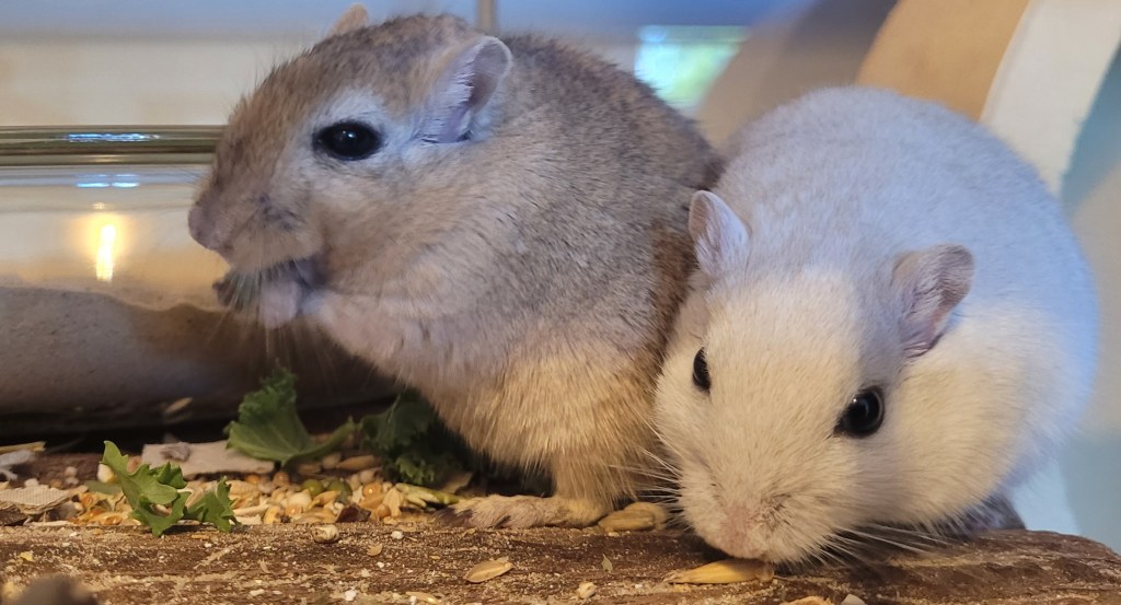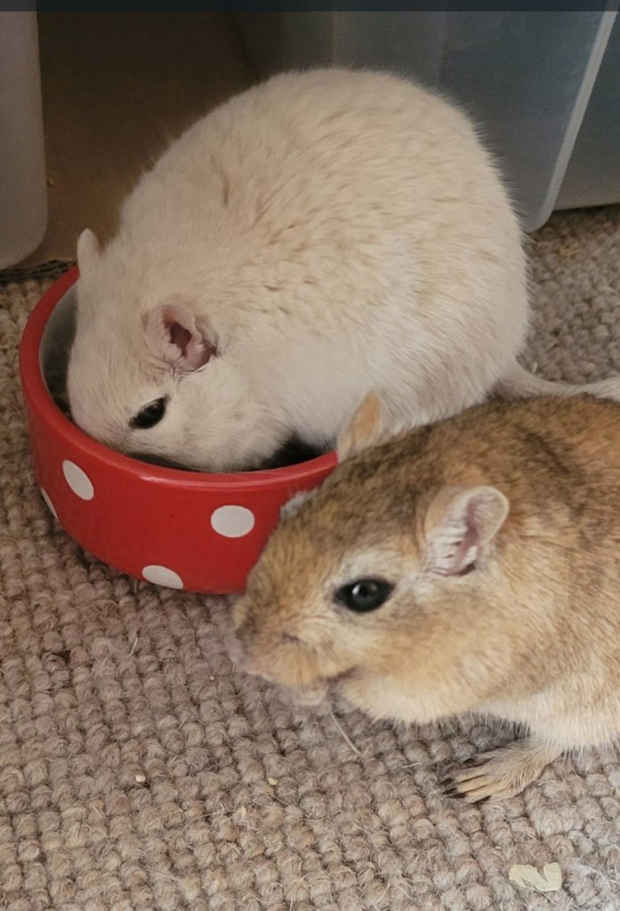 Scatter feed Gerbils. Don’t provide a food bowl, just scatter their usual daily food over the top of their substrate and tank levels. This encourages their natural foraging instincts, prevents resource guarding (one Gerbil monopolising the food, like Marinakis above) and provides enrichment. It’s fun to watch your Gerbils forage as they would naturally so you can sprinkle forage foods around their tank and in their substrate. As a compliment to their usual daily food, we like Natures Own as they sustainably farm, donate a % of spend to animal charities, use recyclable packing, are chemical free, dust extracted and good value, but do check any ingredients against our unsafe foods list (below). Gerbil safe mixes our Gerbils have enjoyed are Herb Mix with Carrots & Peas & Country Garden Herb Mix & Hedgerow Salad