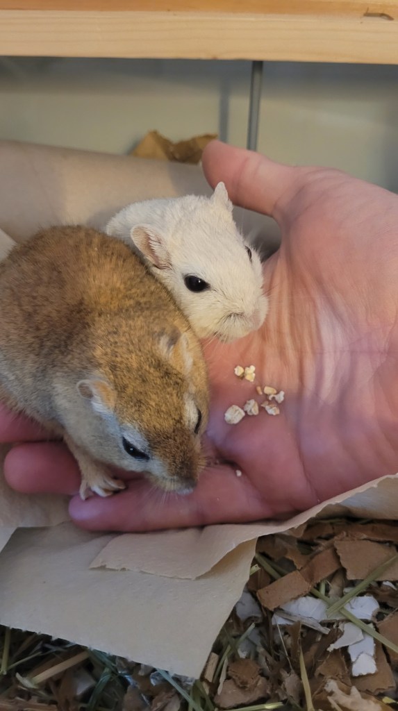 You want to provide a diet that mimics what your Gerbils would eat in the wild, where they consume seeds of grasses, grains, roots, herbs and when available berries. Gerbils also eat insects and larvae. Give your gerbils a good quality dry food as the staple of their diet, with a little insect protein, and fruit and vegetables in moderation. Note, not too much fruit or vegetables as they are high in water content and can cause diarrhoea which can be fatal for Gerbils. As a basic rule, a thumbnail size per Gerbil, no more than twice a week. A Gerbil should consume 5g of dry diet per day – Gerbils – Exotic and Laboratory Animals – MSD Veterinary Manual,