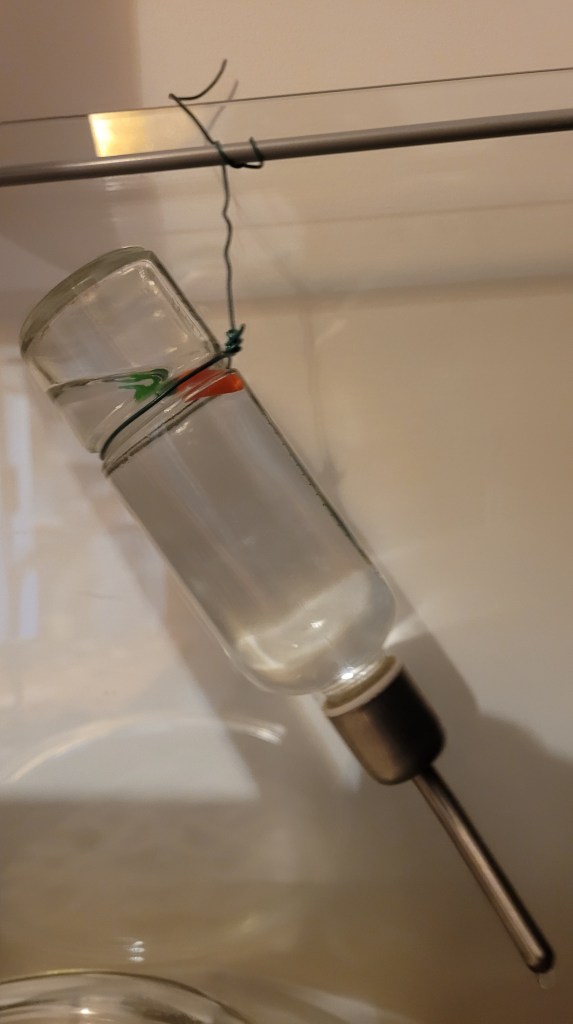 Cheap Garden Wire Holder: If you are on a budget and have metal struts or vents in your tank you could suspend a glass water bottle by wrapping the garden wire around the groove at the base of the bottle and hanging it. The wire will be high up so there is no chance of your Gerbils getting near it. It will be more fiddly to change the water as you’ll need to unwrap the wire from whatever it’s hanging from.