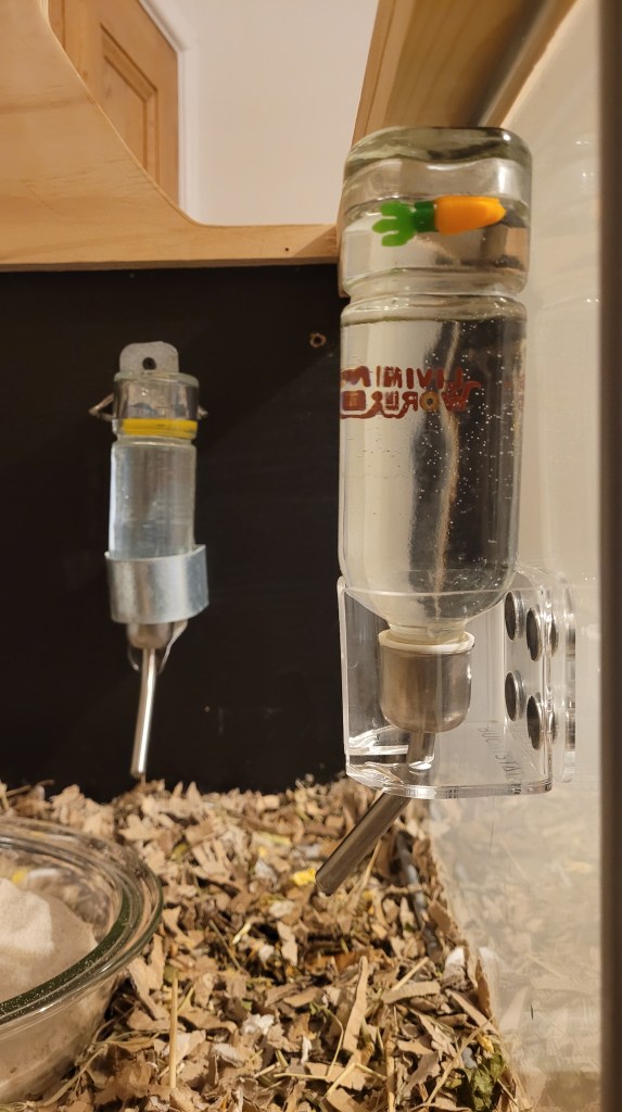 Metal Water Bottle Holders: If you have wooden ends in your tank like the Detolf or the Marrakesh then you can screw the Lixit Metal Water Bottle Holder (US import) or Kaytee Metal Water Bottle Holder 4/8oz into the wood and use a 177ml Living World Glass Water Bottle